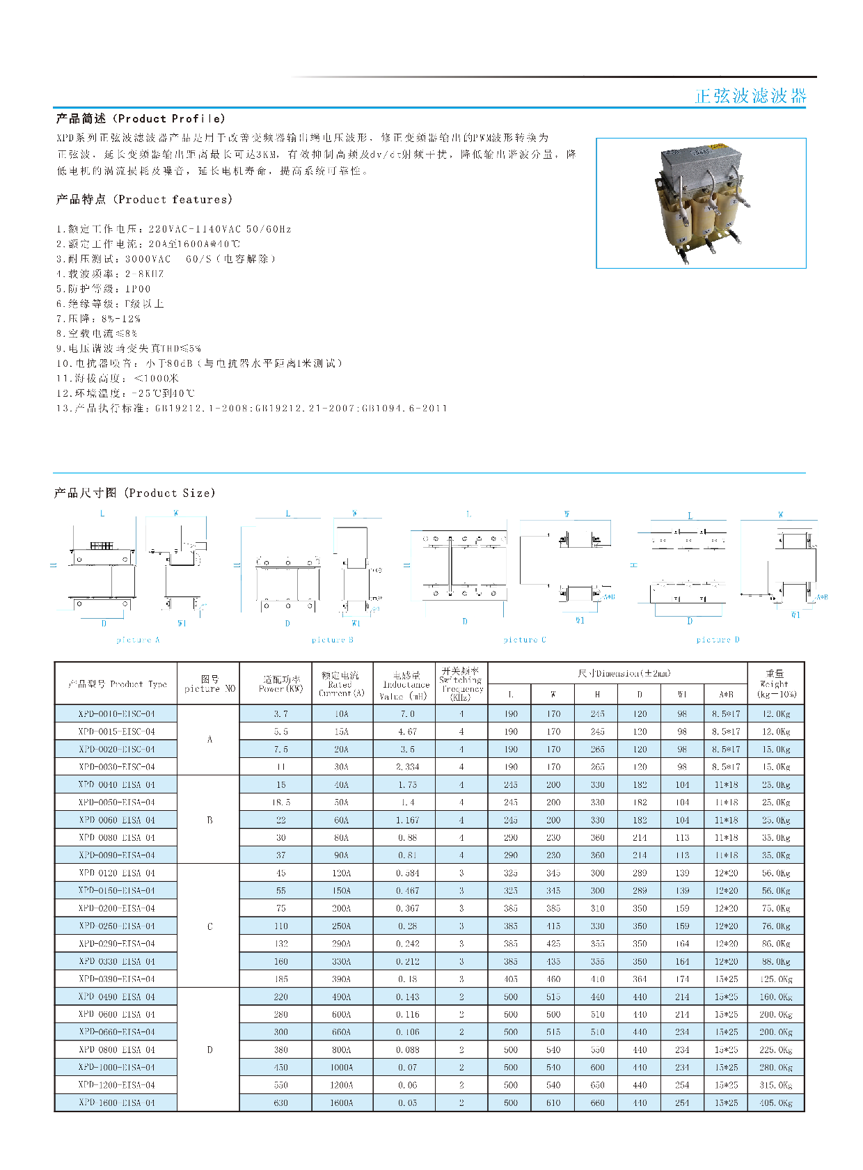 XPD系列(lie)正(zheng)弦(xian)波(bo)滤波(bo)器产(chan)品是用于改善变频器输(shu)出(chu)端(duan)电压波(bo)形(xing),修正(zheng)变频器输(shu)出(chu)的PWM波(bo)形(xing)转换为正(zheng)弦(xian)波(bo),延长(zhang)变频器输(shu)出(chu)距离最长(zhang)可(ke)达3KM,有(you)效抑(yi)制高(gao)频及dv/dt射频干扰,降低输(shu)出(chu)谐(xie)波(bo)分量,降低电机的涡流损耗(hao)及噪(zao)音,延长(zhang)电机寿命,提高(gao)系统可(ke)靠性。
